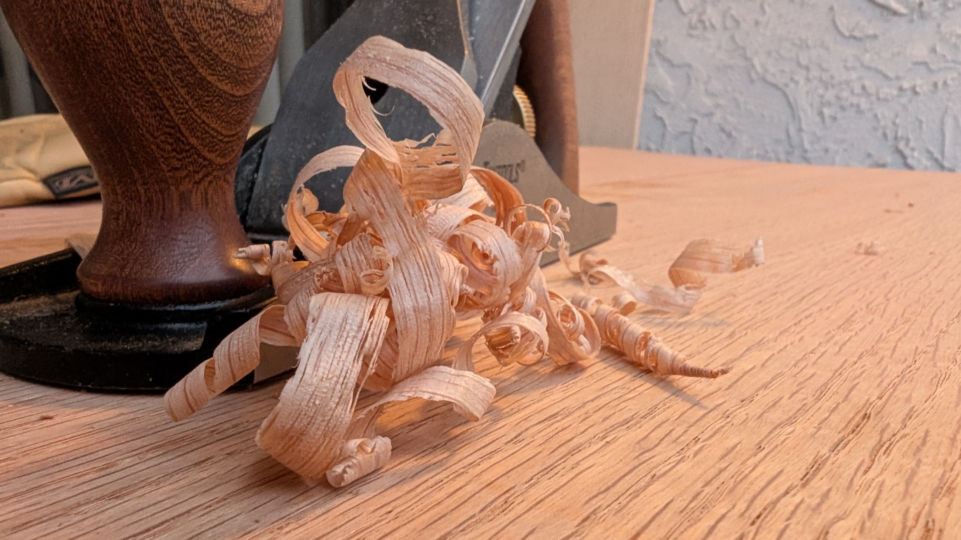 The shavings I was getting were actually very nice and I was able to plane down to a very reflective surface in the end 😄 . Though I realize it’s hard to see there is some reflection coming off of the table top in the picture below. Random oak chunk for comparison.